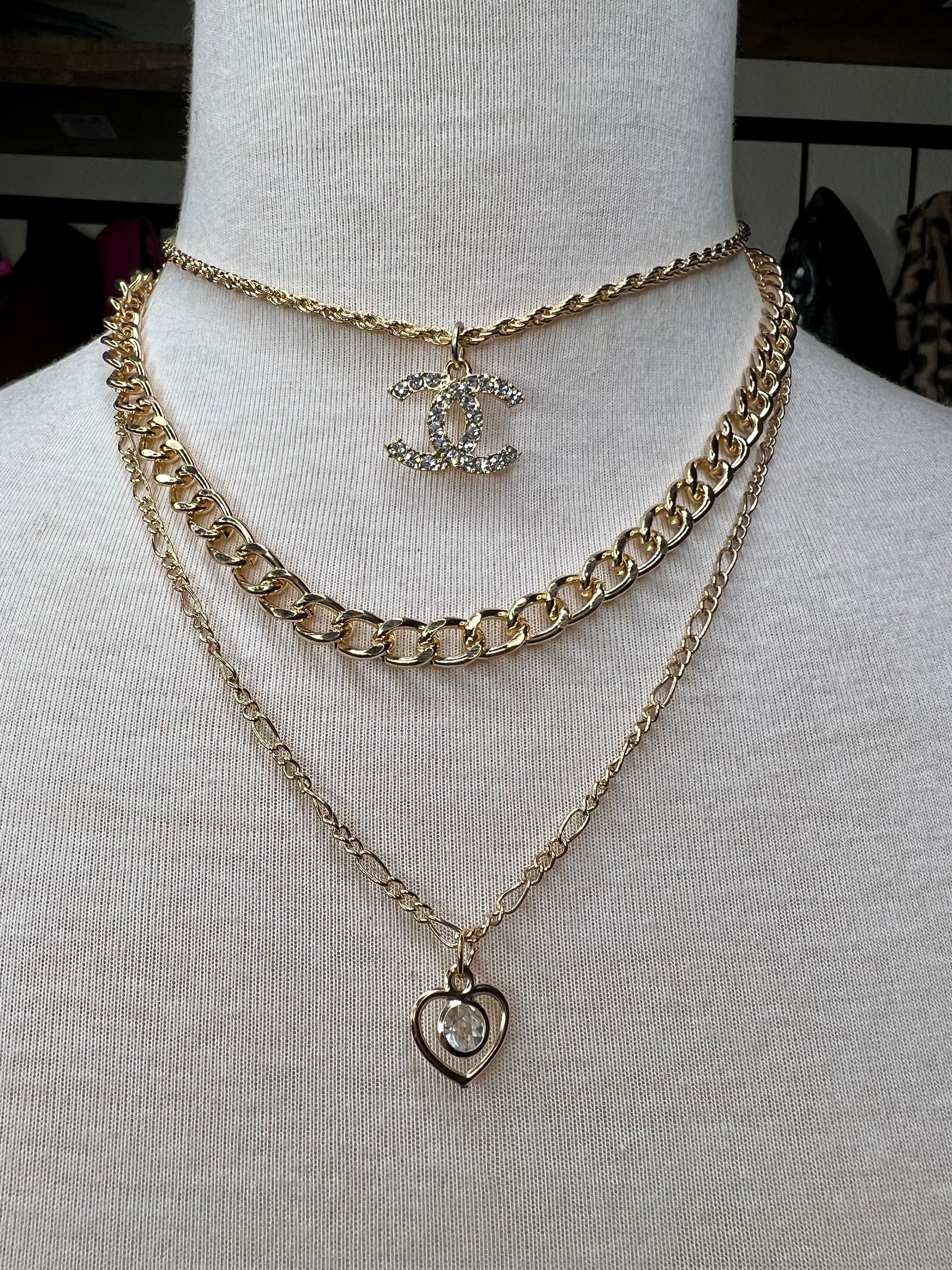 Theee layers of Chains with a Repurposed Designer Rhinestone Charm and a tiny Heart pendant embellished with a Crystal.