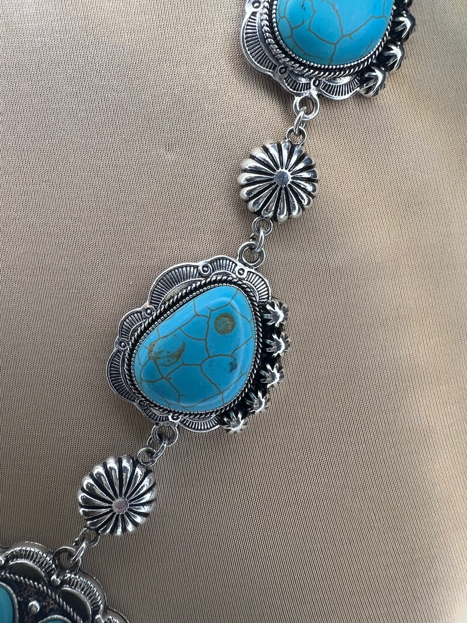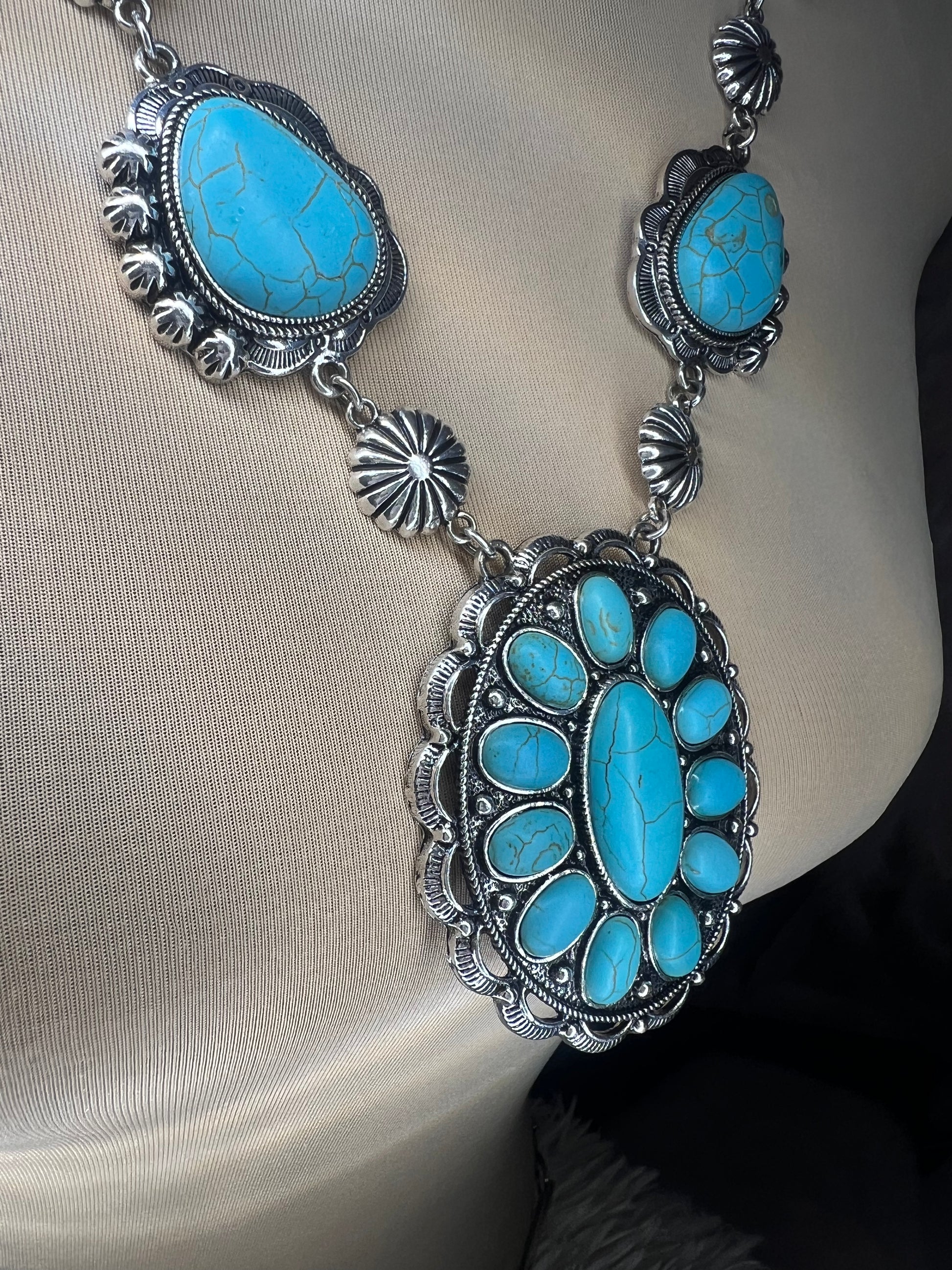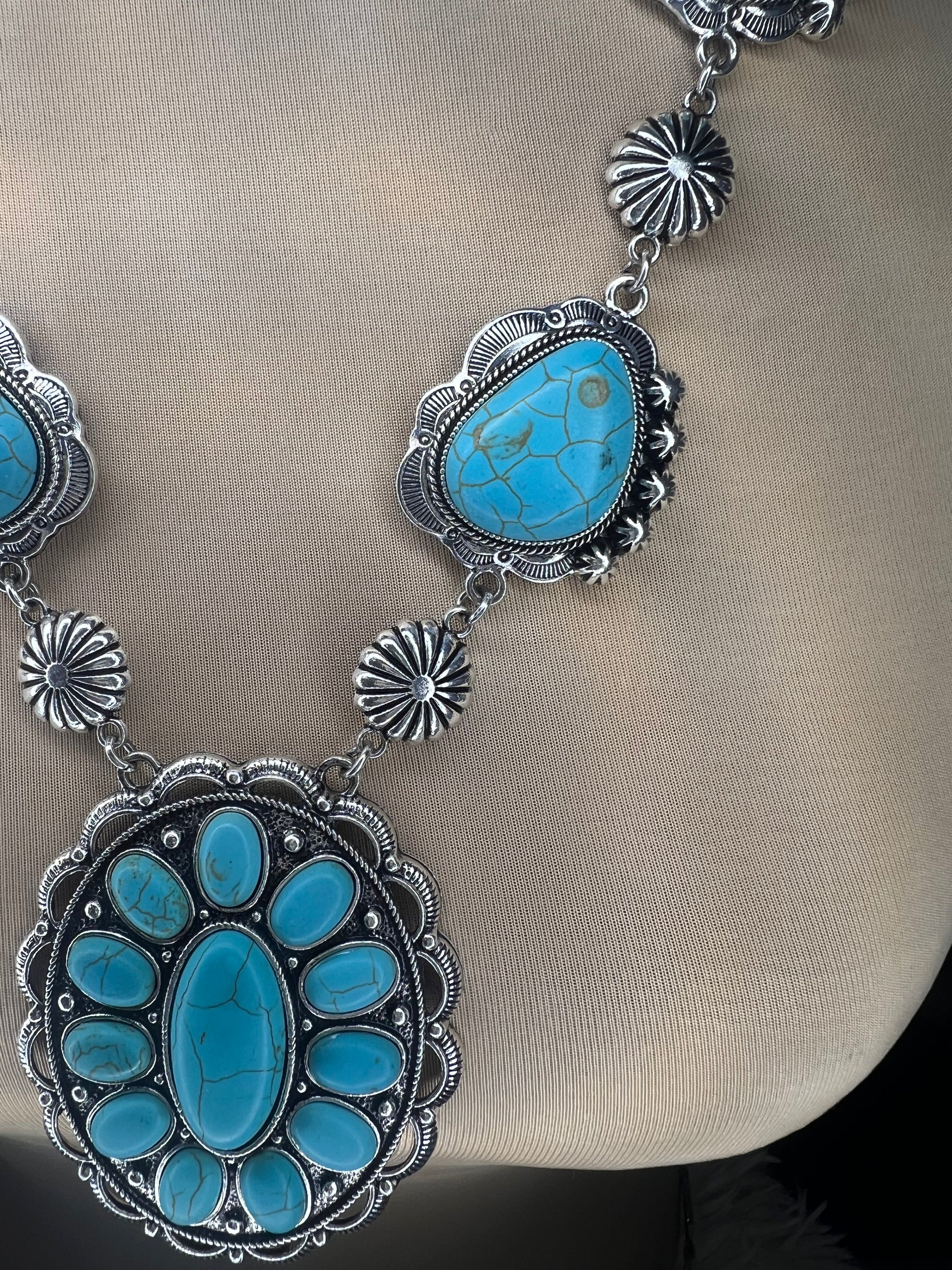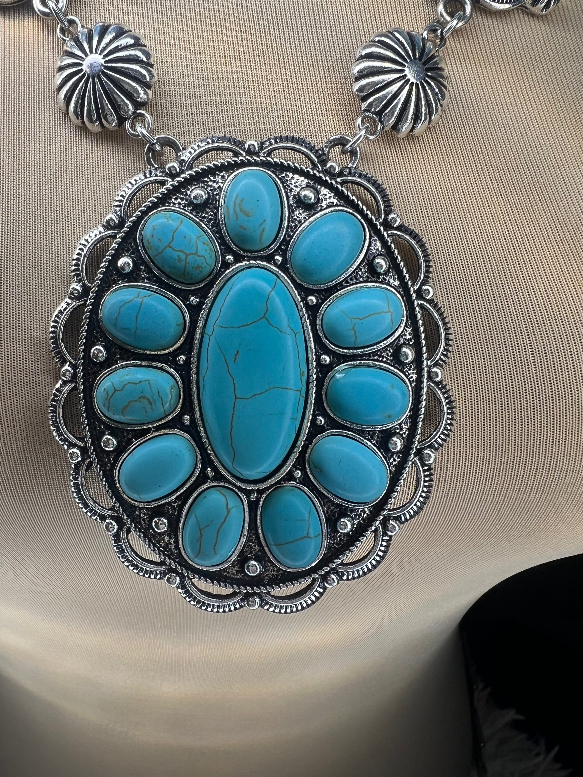 Luna Boho western concho Statement necklace , has one Large faux Turquoise Stone pendant . Embellishment Around the necklace it Alternates from medium Turq Stone teardrops with small Navajo flower Pendant