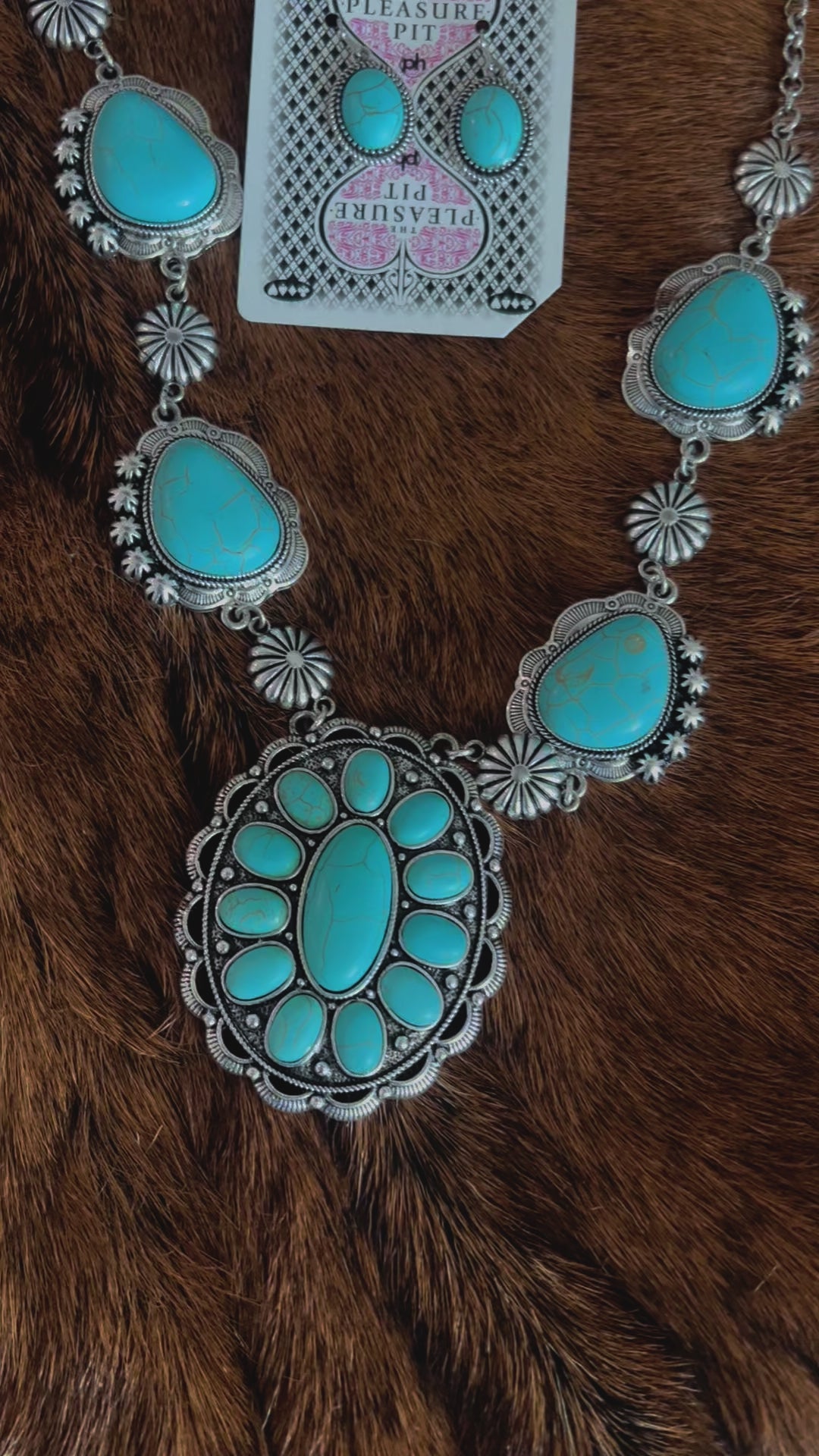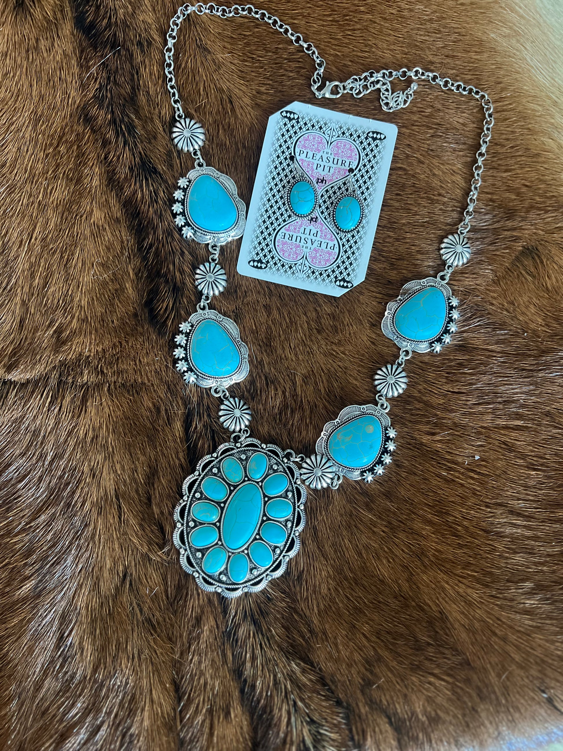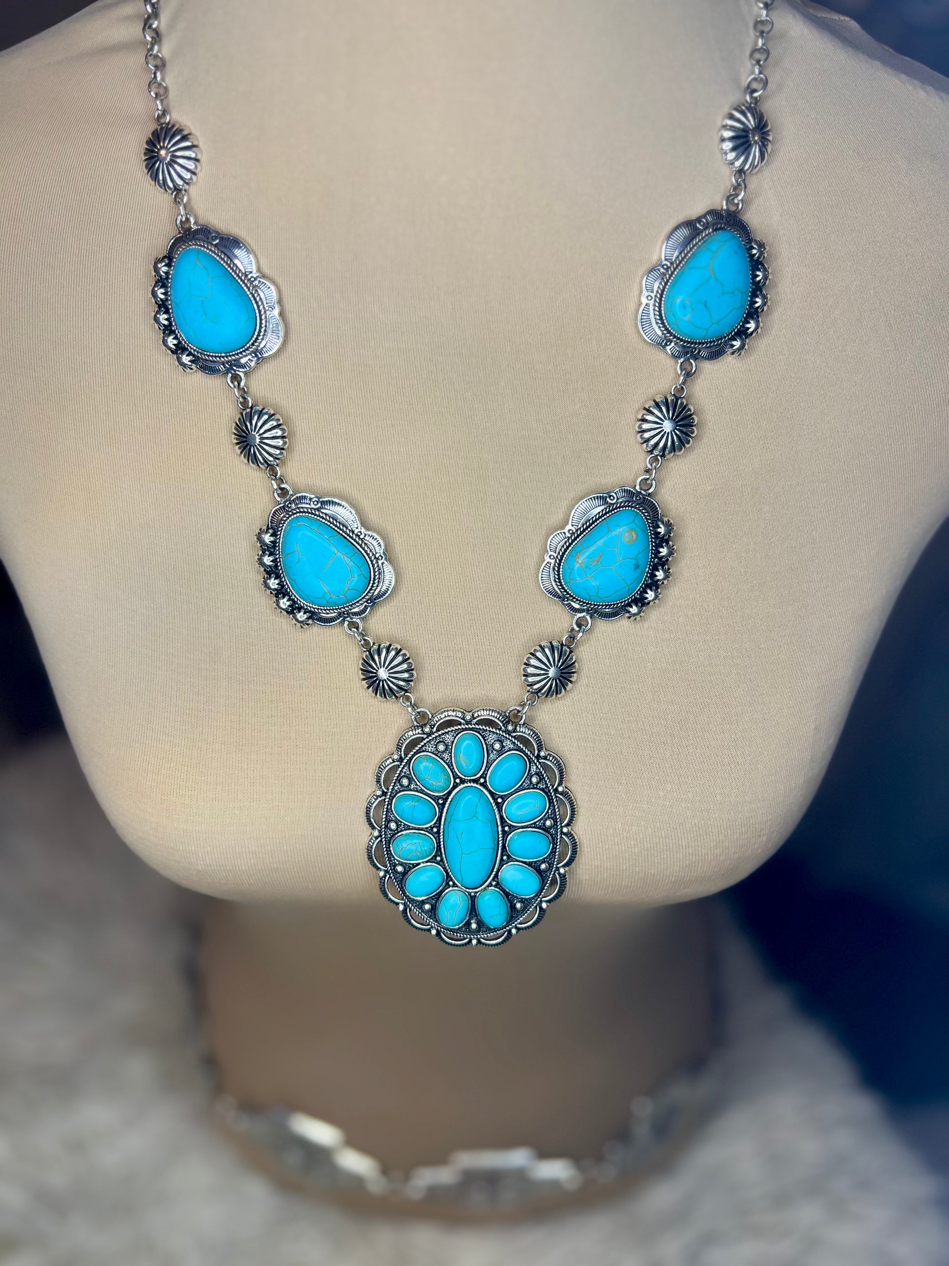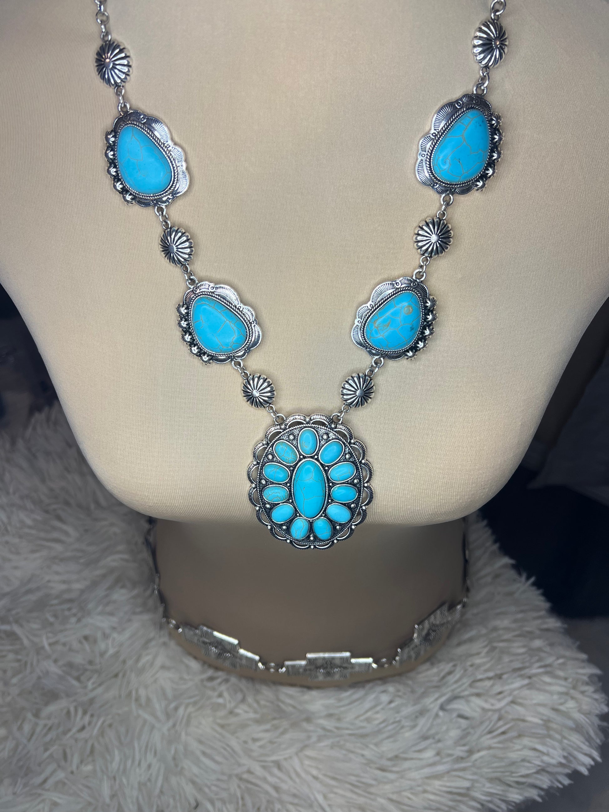 Luna Boho western concho Statement necklace , has one Large faux Turquoise Stone pendant . Embellishment Around the necklace it Alternates from medium Turq Stone teardrops with small Navajo flower Pendant