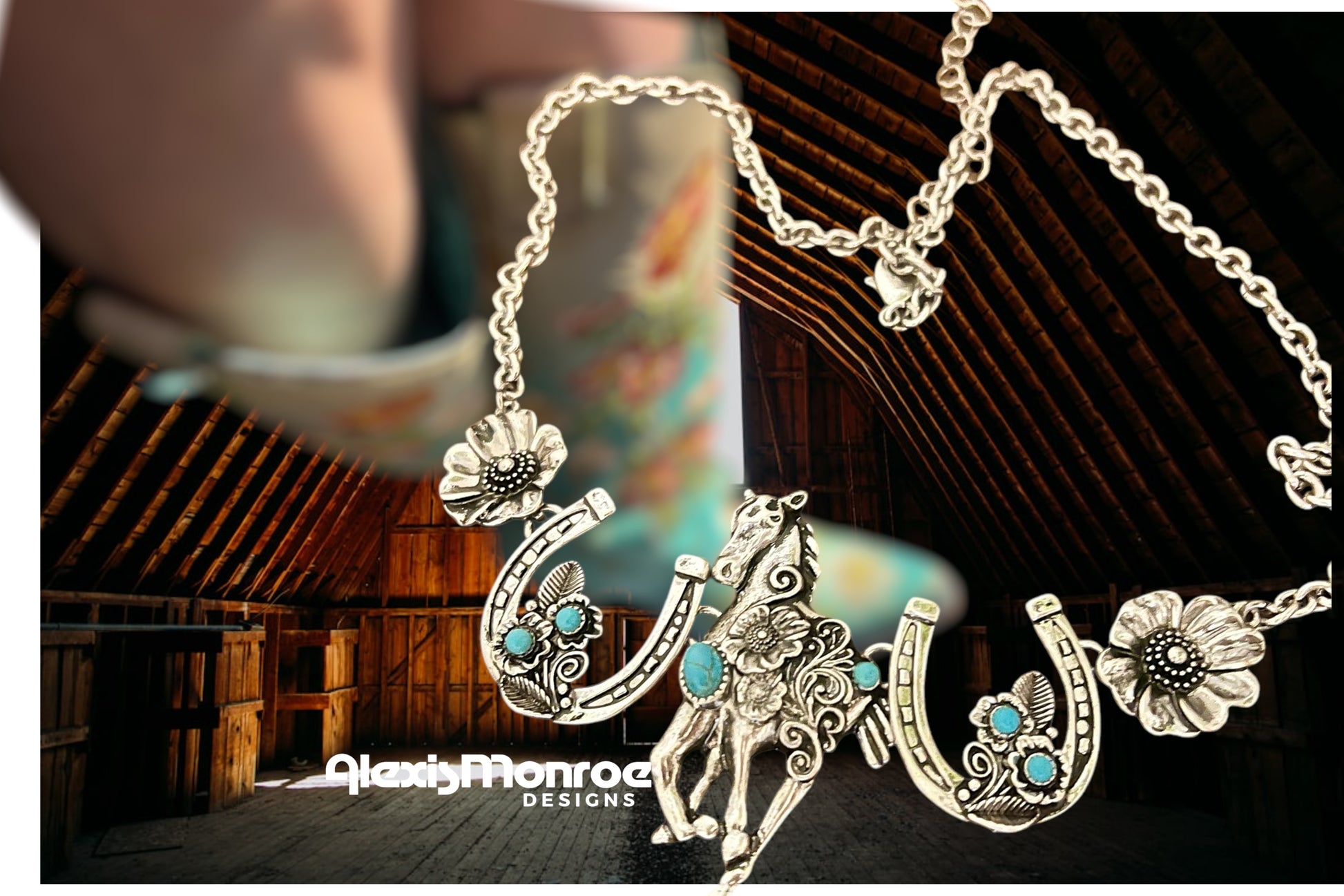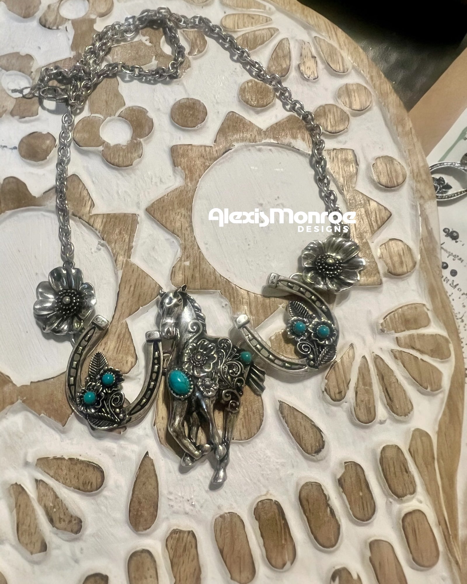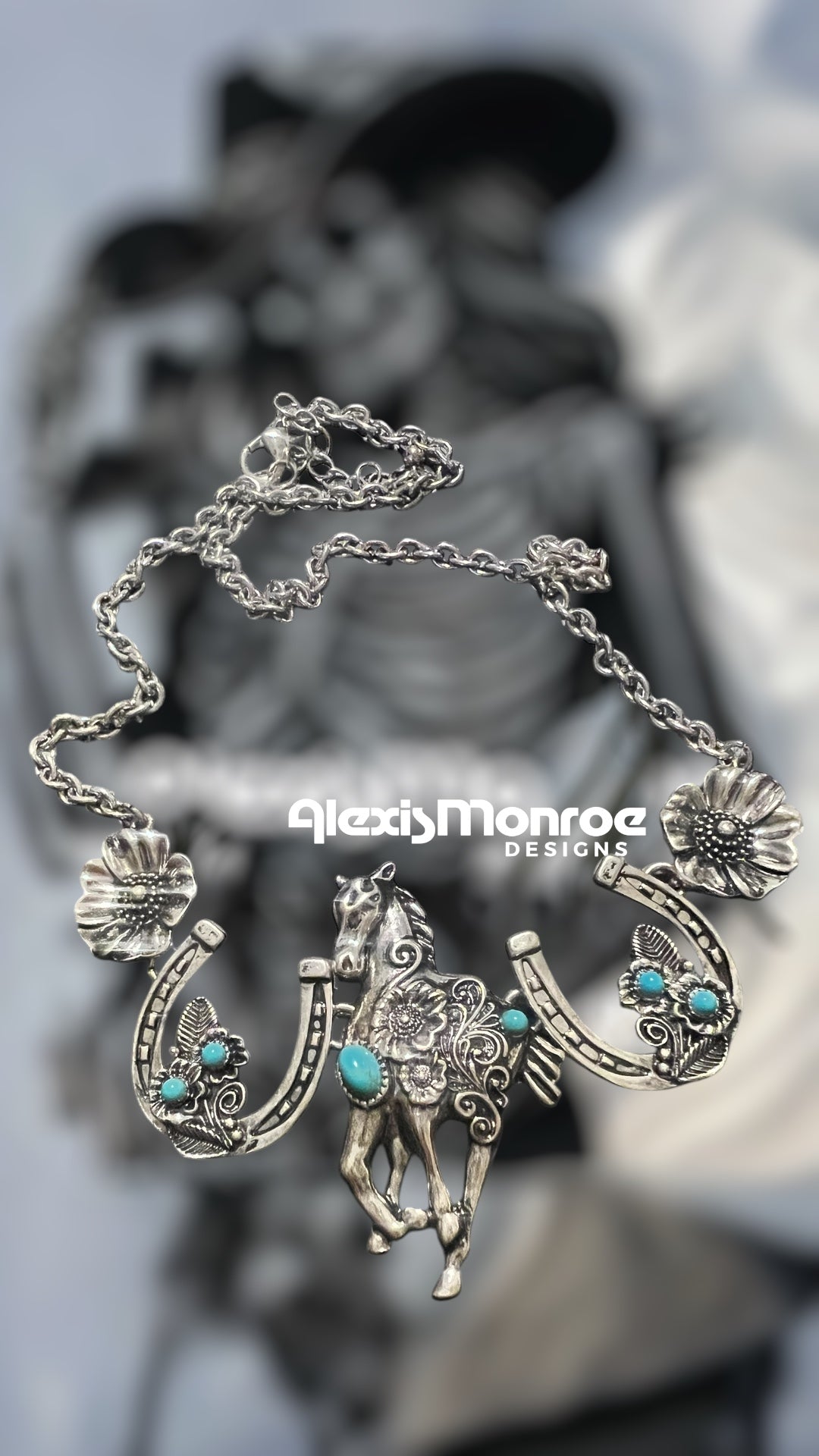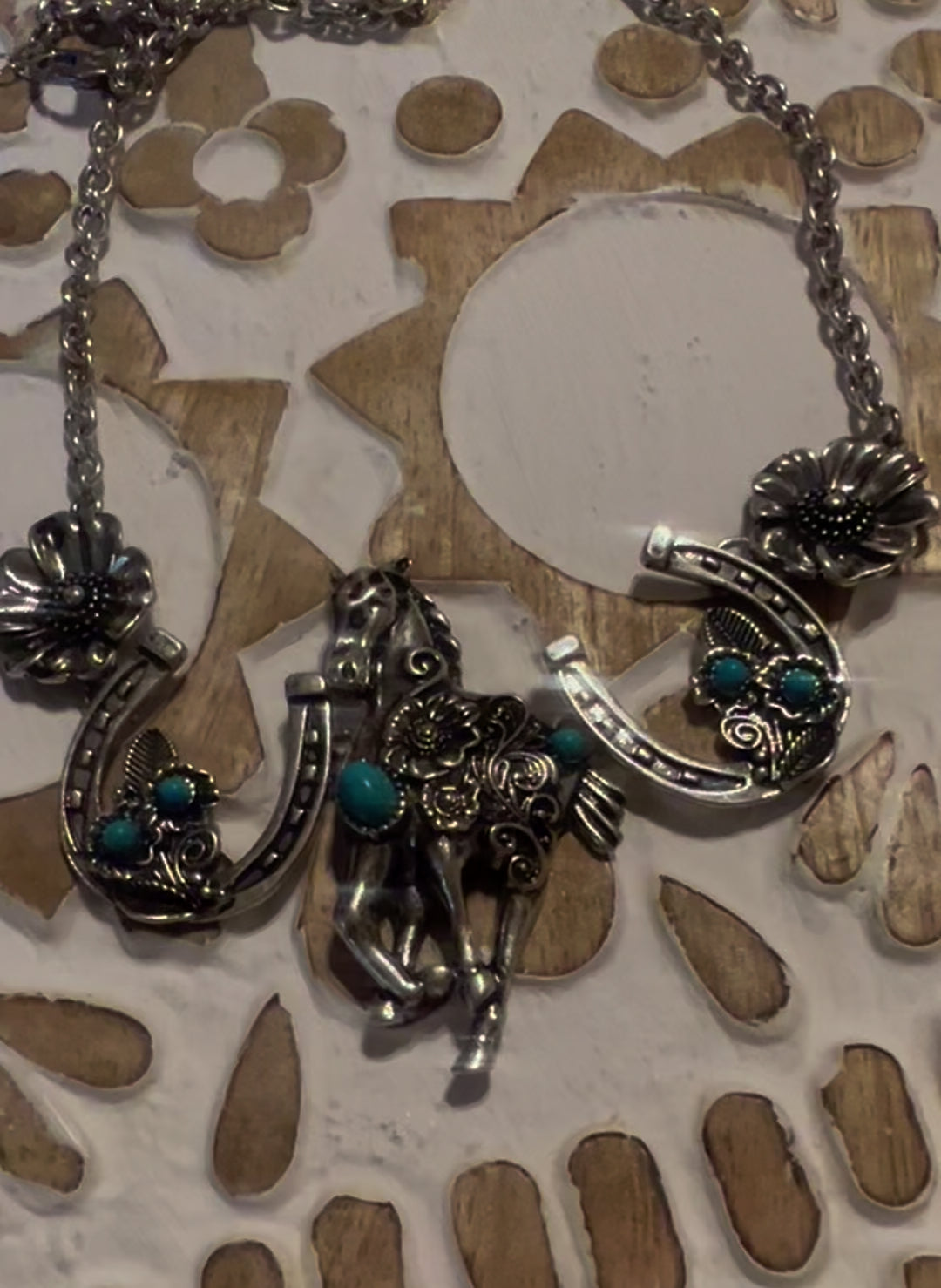 Embellished with small howlite gems the finish makes this piece so beautiful adorn with wildflowers and roses along the horse horseshoes are detailed .